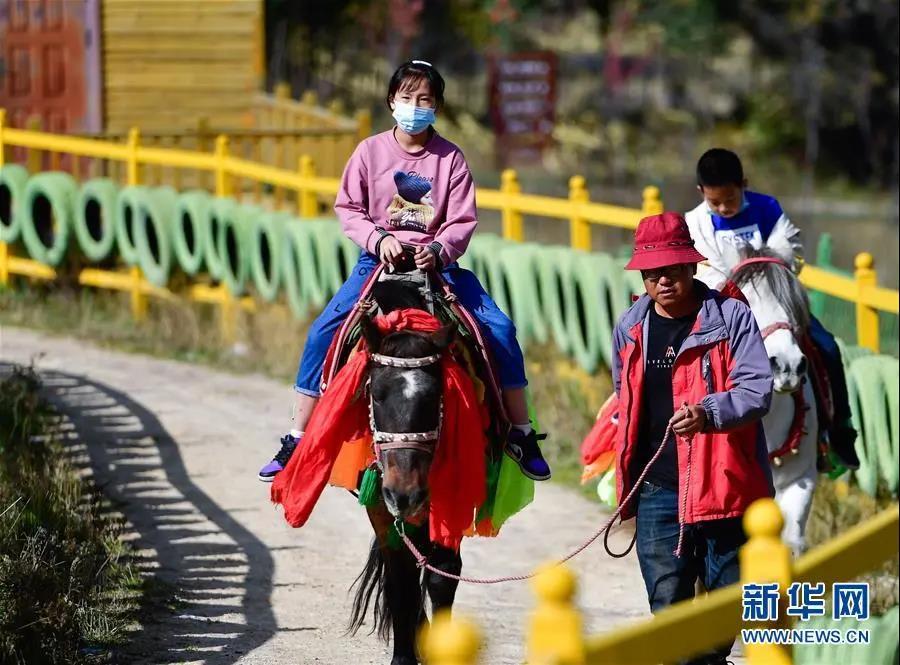 10月7日,在卡阳村景区内务工的村民王进成(左二)带着游客体验骑马。新华社记者 张龙 摄