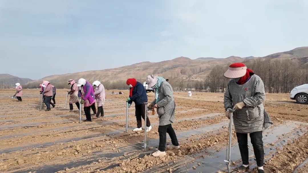 “戳6公分,2寸就可以,别挖深,距离就是一平脚……”暖棚外的鲜食蚕豆地里,工人手中都握着一台小巧且实用的蚕豆播种设备整齐地排成一列。梁昇先向工人讲解种植要点后大家开始点播。