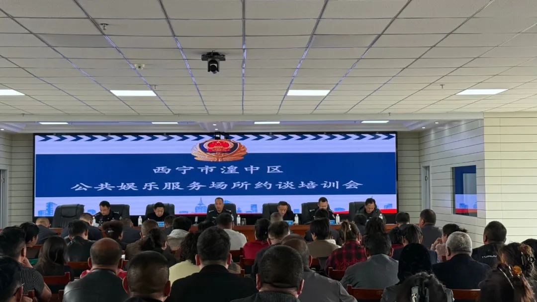 为进一步加强辖区重点行业场所治安管理工作,严格落实平安建设要求,切实提高重点行业场所治安管理工作水平,增强各行业场所规范、合法经营的意识,履行保护未成年人法定义务,防范未成年人违法犯罪。近日,区局组织辖区内所有旅店业、娱乐场所、酒吧(KTV)、台球室、网吧业主召开“西宁市湟中区公共娱乐服务场所约谈培训会”。区教育局、市场监督管理局、文体旅游局、区公安局相关各所队负责人参会,区公安局党委委员、副局长费广德参加会议并讲话。