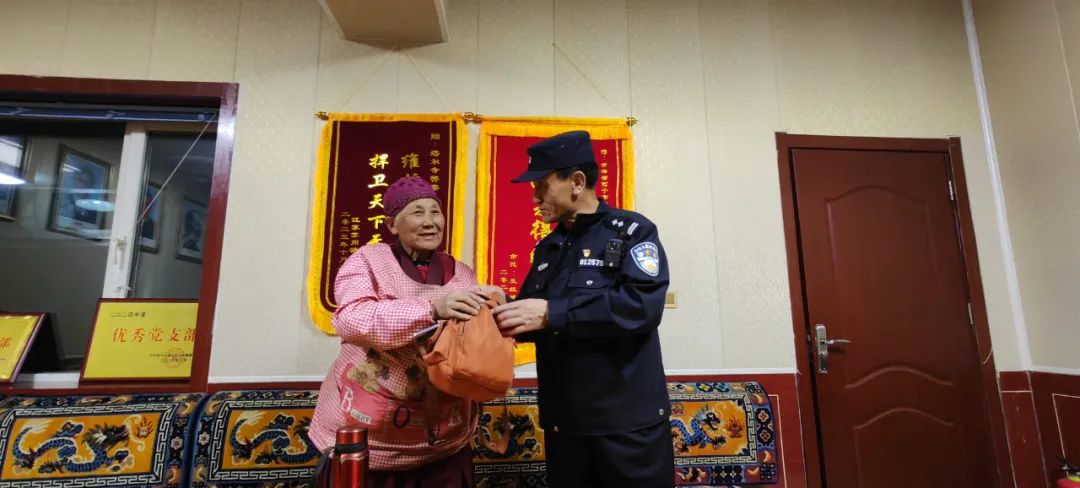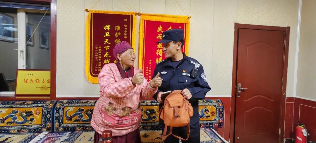 原来,亮奶奶在塔尔寺郭拉路转经时,不慎丢失自己的包,包内有手机、钥匙等贵重物品,天色已晚,亮奶奶心急如焚,拉着民警的手着急的诉说,如若找不到钥匙就进不了家。值班民辅警一边安慰失主亮某,一边迅速组织警力开展失物搜寻工作,通过沿线寻找,走访群众,两个小时后终于找到了包,亮奶奶拿到失而复得的包后,竖起大拇指连声道谢。