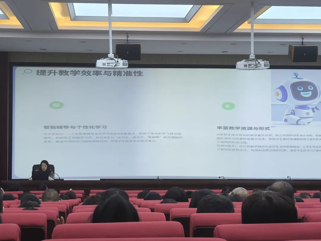 会上,全体教师通过观看《全国人工智能校长局长专题培训班》优秀微课堂视频、学习教育部优秀案例,全面了解AI技术在全国前沿课堂中的创新应用。个别教师结合学科特点分享展示AI赋能课堂教学实践成果和经验。例如,通过应用AI虚拟人物构建互动场景,学生可在线提问,实现课堂“沉浸式”学习;借助AI分析时事热点,生成动态教学资源,助力政治课堂核心目标高效达成;运用AR立体建模技术,将抽象几何问题可视化,突破学生空间思维瓶颈,为学校教师提供实践参考。