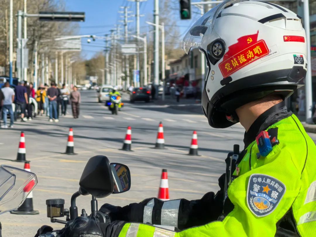 “请减速慢行,前方车流较大!”在迎宾大道执勤点,党员民警程晓蕾手持喇叭疏导车辆。大队在9个主要路口设置先锋岗,日均疏导车辆1.2万台次。5月2日,激增车流导致迎宾大道路段堵车,车流缓慢,民辅警及时疏散车流,确保主干道无长时间拥堵。截至目前,共查处交通违法130余起,救助受困车辆23台,全区未发生重大交通事故。