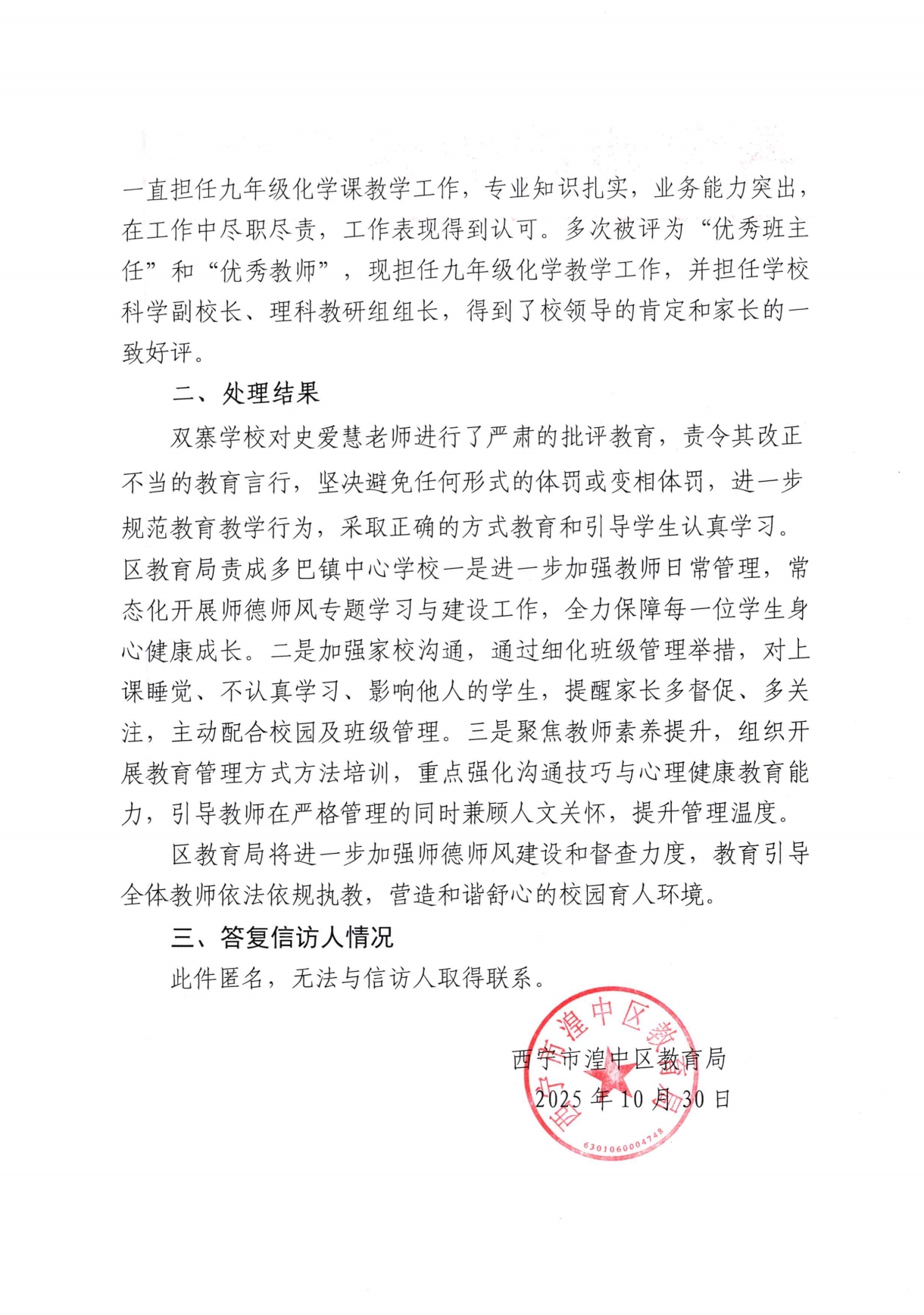 关于双寨学校九年级化学老师体罚、辱骂学生的匿名举报信 尊敬的学校领导/教育监管部门: 您好!我是双寨学校的一名学生(为保护自身安全,特此匿名举报),现向您实名反映我校九年级化学老师在教学过程中存在的严重不当行为,该行为已对学生身心造成不良影响,具体情况如下: 该化学老师多次在课堂上,因学生出现上课睡觉的情况,采取了不符合教育规范的处理方式。一方面,存在体罚行为,曾直接用教鞭或者橡皮手掌抽打睡觉学生的手掌,或要求学生在教室后排做俯卧撑,期间不允许喝水 另一方面,伴随严重的言语辱骂与阴阳怪气,例如当众斥责学生“上课只会睡觉浪费资源”“驴都比你们聪明等”,还会用“某些人活着就是给班级拖后腿”等讽刺性语言对学生进行人身攻击,并且次数较为频繁 希望严查 此类行为不仅违背了教师教书育人的基本准则,更严重伤害了学生的自尊心,导致部分学生对化学学科产生恐惧心理,甚至不敢正常参与课堂互动,严重影响了班级的学习氛围与学生的心理健康。 恳请相关部门能对此事进行严肃调查核实,制止该老师的不当教育行为,并采取有效措施保障学生的合法权益与身心健康,营造安全、尊重的校园学习环境。 举报人:匿名学生 日期:2025年10月28日