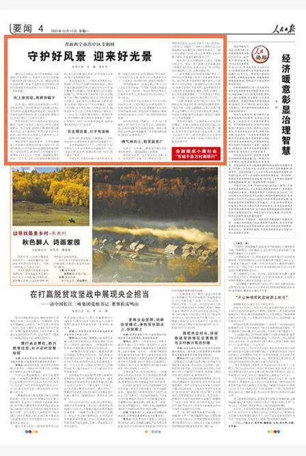 《人民日报》10月12日4版头条以《青海西宁市湟中区卡阳村--守护好风景 迎来好光景》为题,报道了湟中区拦隆口镇卡阳村通过精准扶贫工作,从昔日远近闻名的贫困村,到如今的全国乡村旅游重点村,在守护绿水青山中,走出了一条致富路的典型事例。