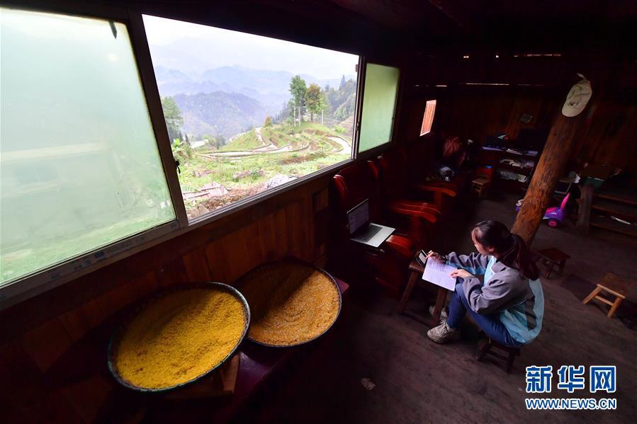 在广西融水苗族自治县杆洞乡党鸠村,就读于广西科技师范学院的梁孟香在家里上网课(4月9日摄)。新华社记者 黄孝邦 摄