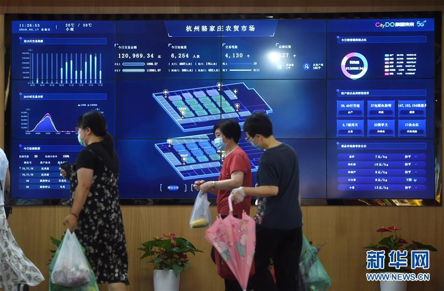浙江省杭州市的5G农贸市场--骆家庄农贸市场的大屏幕上实时显示交易、客流等相关情况(5月17日摄)。新华社记者 韩传号 摄