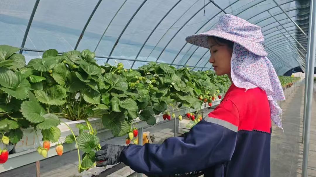 东智每天的任务不仅要管护草莓,还要采摘已经成熟的草莓,在这里采摘无需弯腰,推着小车穿梭在支架间,劳动效率得以提升。