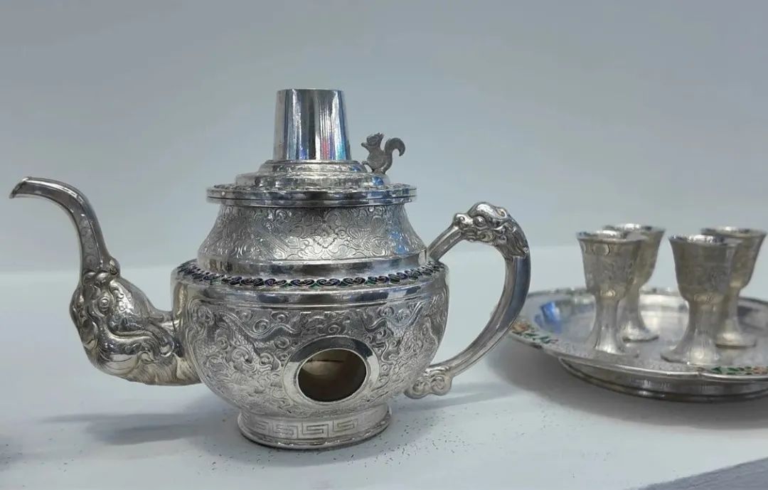 湟中银铜器制作及鎏金技艺历史悠久,是当地传统手工艺的杰出代表。此次青洽会多彩非遗现场技艺展区湟中非遗项目共展出银铜器30件,其中10件为精品代表作,展品丰富多样,涵盖了酒具、茶具、首饰、餐具以及工艺品等类别。