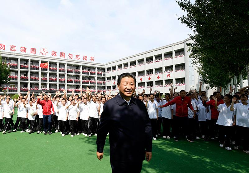 9月13日至14日,中共中央总书记、国家主席、中央军委主席习近平在陕西省榆林市考察。这是14日上午,习近平在绥德实验中学考察时,同师生亲切交流。新华社记者 谢环驰 摄