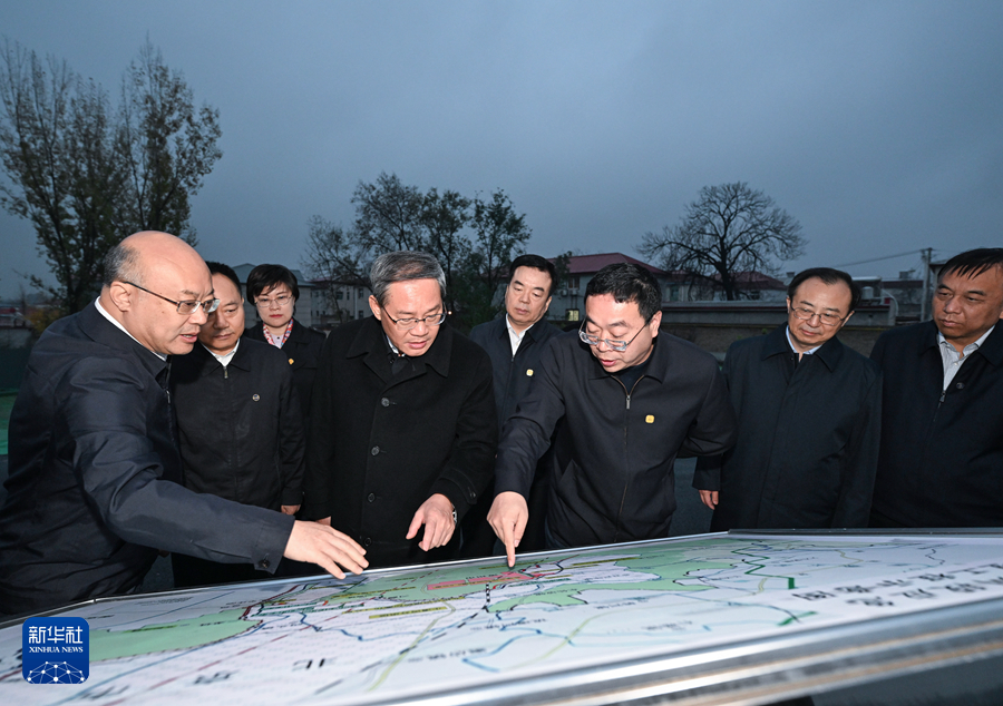 11月13日,中共中央政治局常委、国务院总理李强在河北调研。这是李强在涿州市小清河分洪区南围堤建设工程现场,察看项目最新进展,听取河北省灾后重建重大水利工程等情况汇报,与设计施工监理人员交流。新华社记者 饶爱民 摄