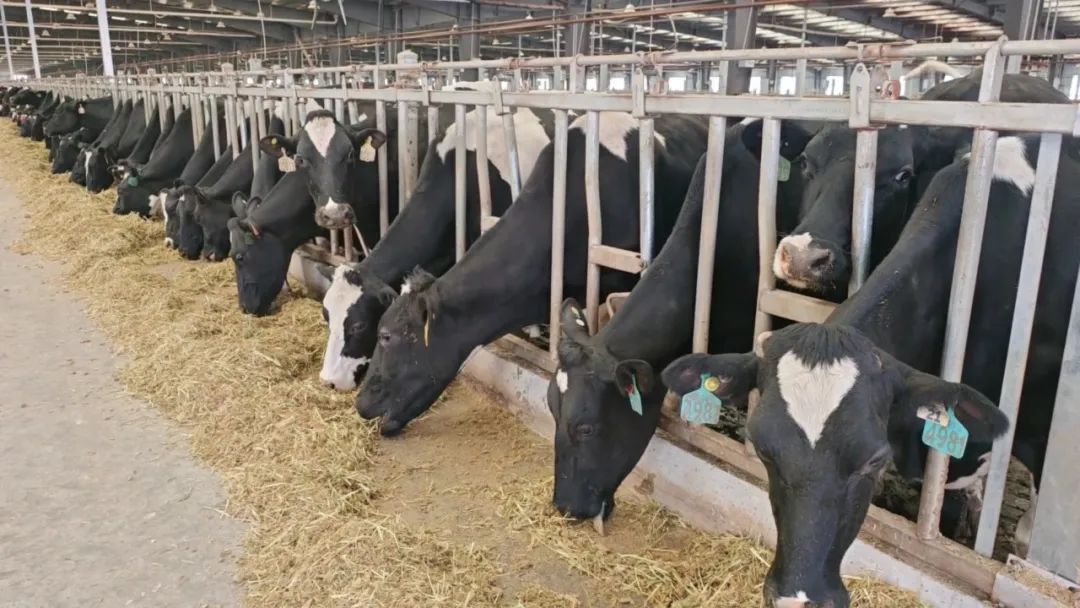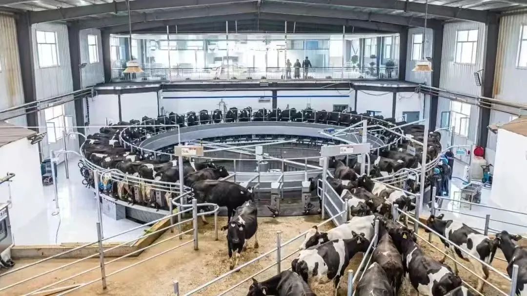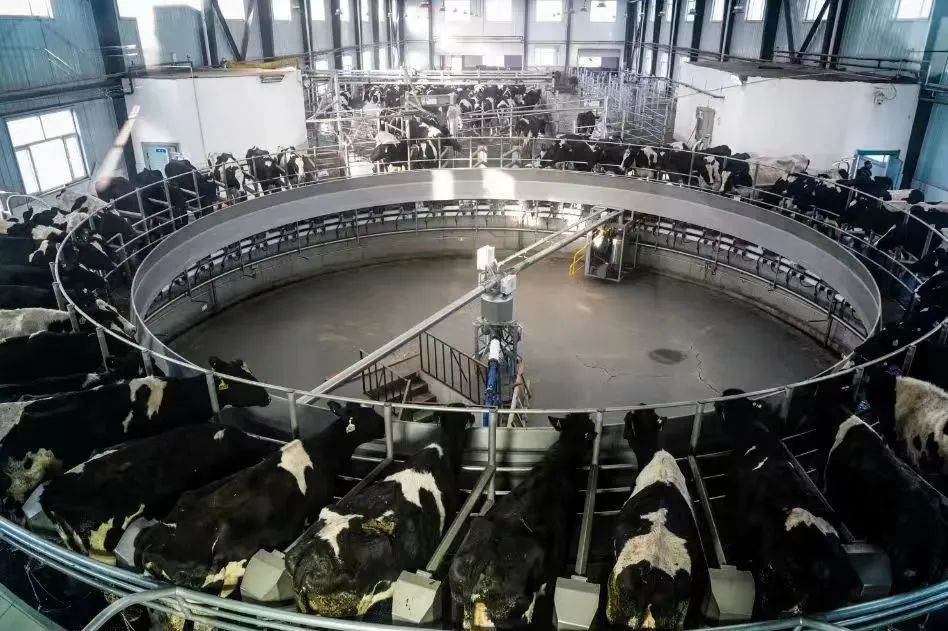 早上7点,一头头奶牛沿着特定通道,进入挤奶转盘,每头牛对应一套挤奶设备,挤奶盘上可同时容纳50头奶牛。工人们有条不紊地清洗、消毒、安装挤奶设备……一切准备就绪,挤奶器启动,乳白色的牛奶顺着管道流进奶罐里。整个过程仅用10分钟。