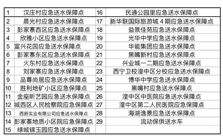 5.为了保障停水区域内用户基本生活需求,我公司将设立28处固定送水点及1处流动送水点。(附:送水点明细表)