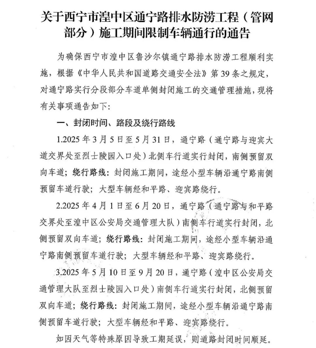 【道路交通】关于西宁市湟中区通宁路排水防涝工程(管网部分)施工期间限制车辆通行的通告