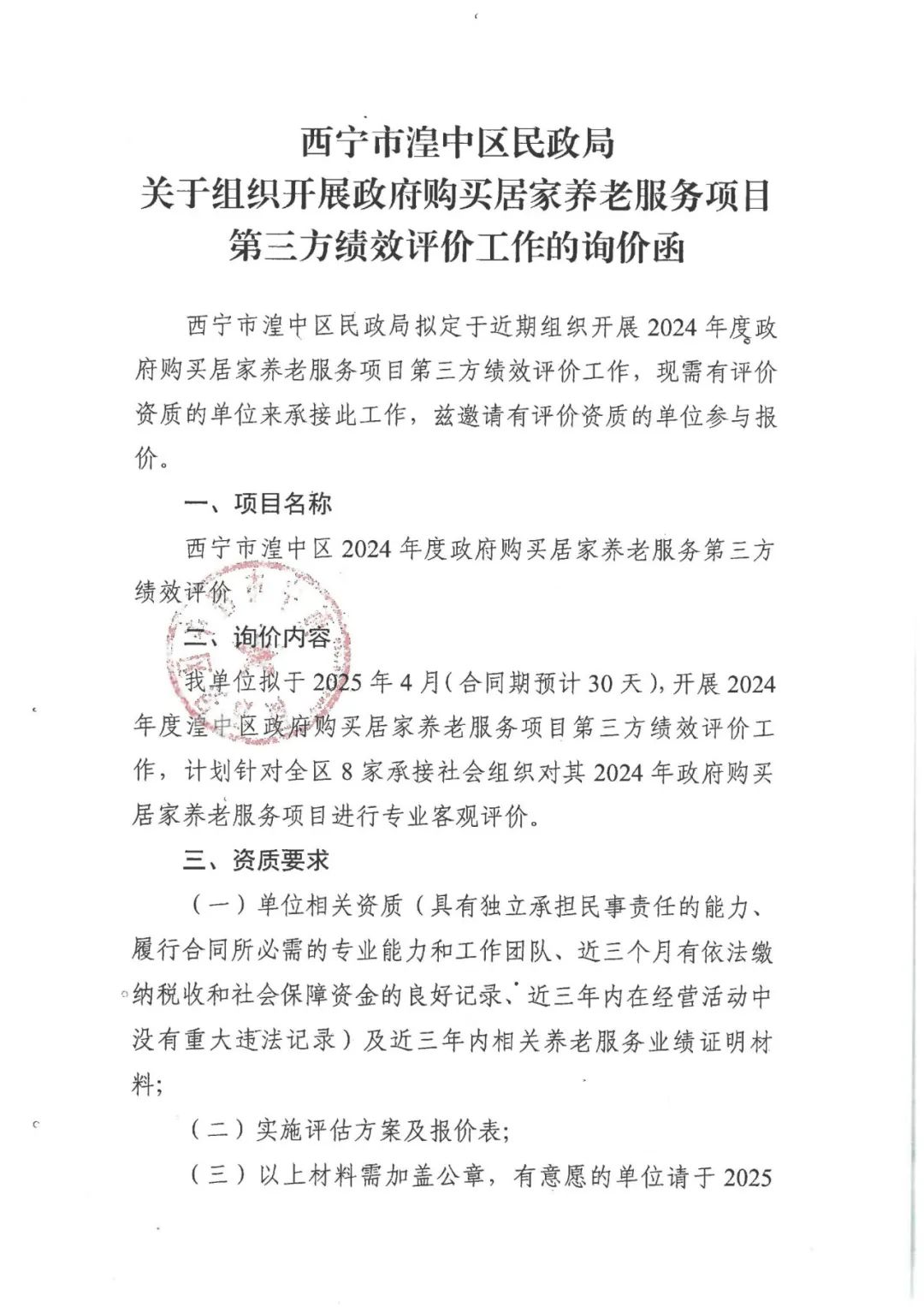 西宁市湟中区民政局关于组织开展政府购买居家养老服务项目第三方绩效评价工作的询价函
