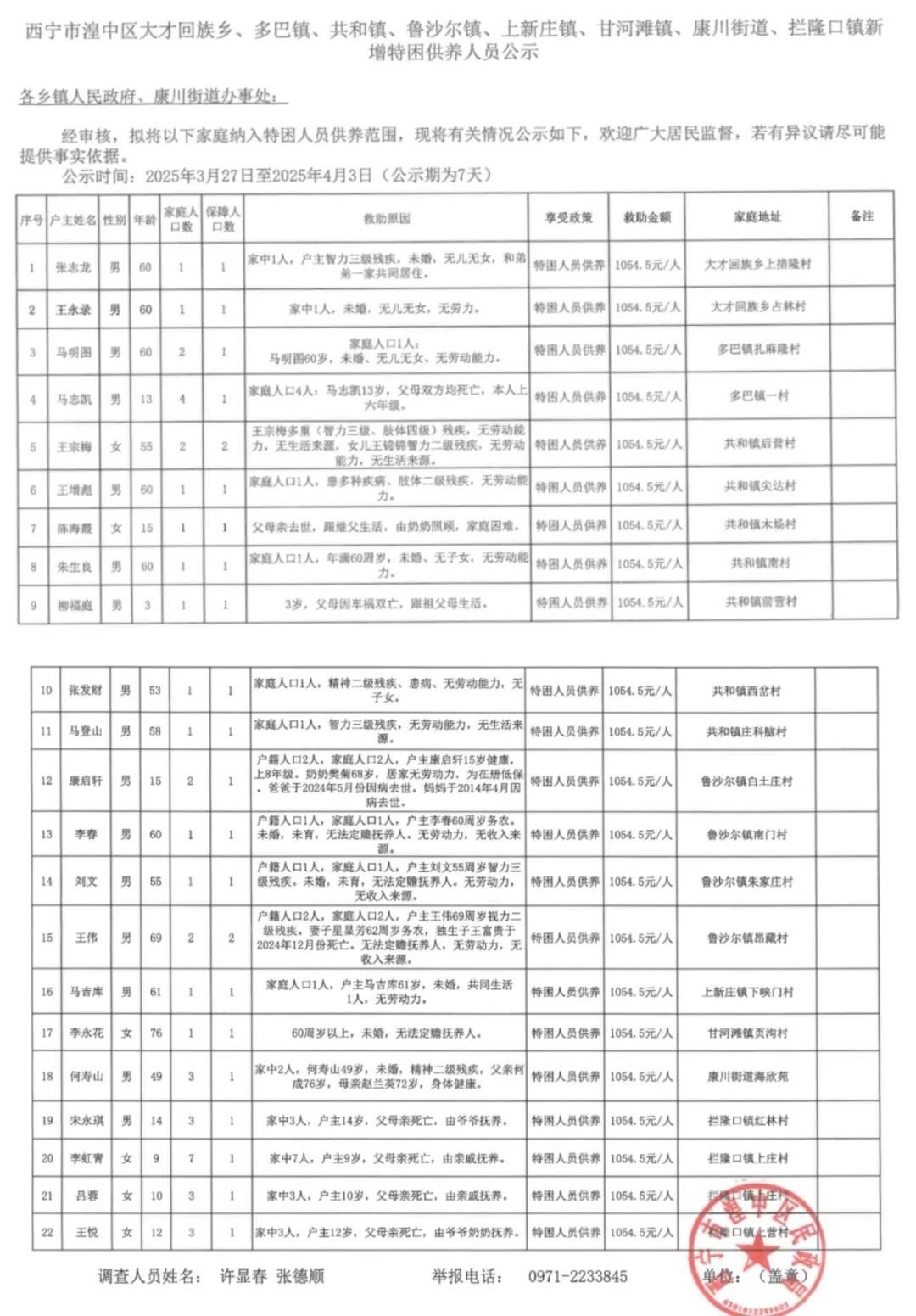 西宁市湟中区大才回族乡、多巴镇、共和镇、鲁沙尔镇、上新庄镇、甘河滩镇、康川街道、拦隆口镇新增特困供养人员公示