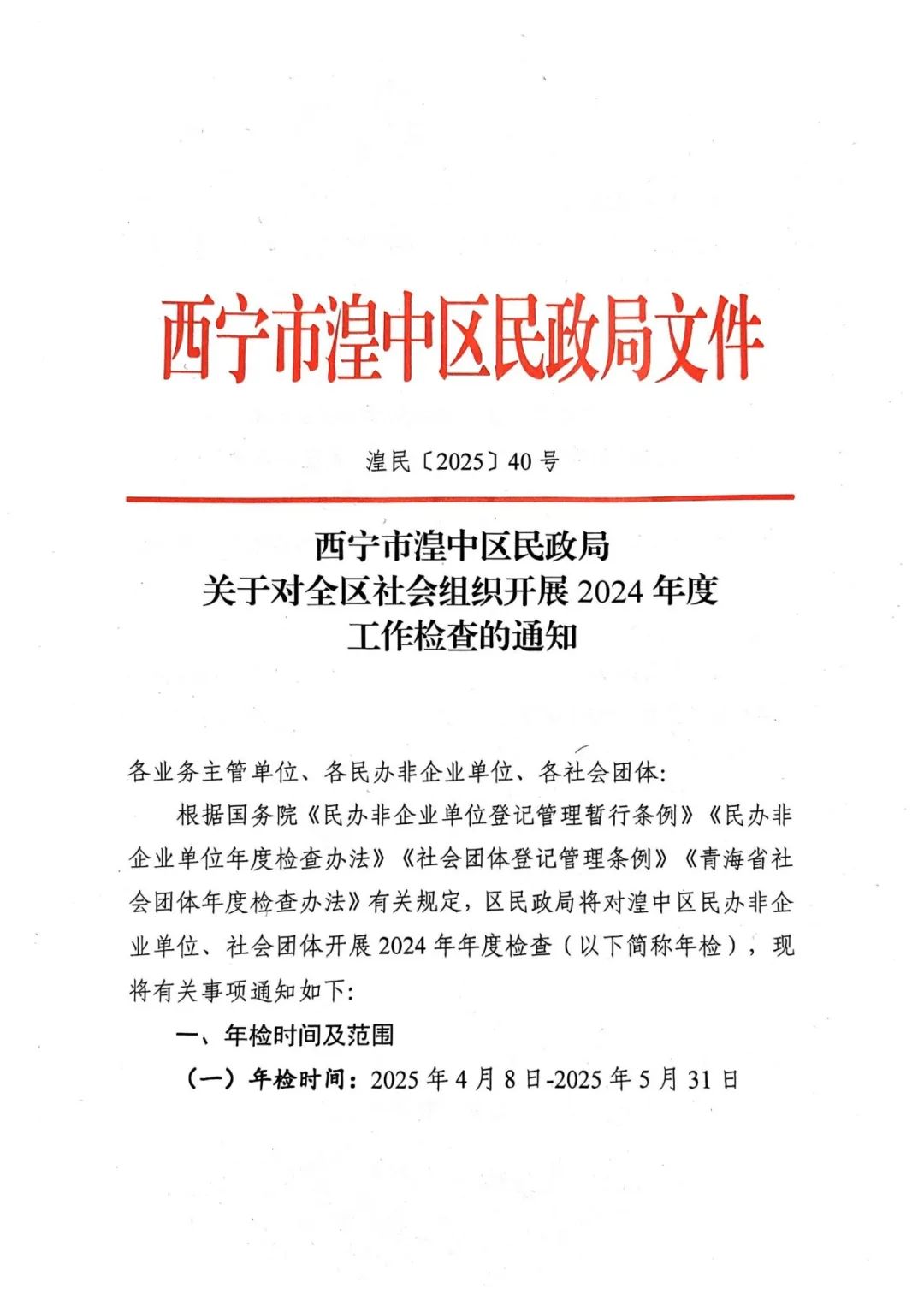 西宁市湟中区民政局关于对全区社会组织开展2024年度工作检查的通知