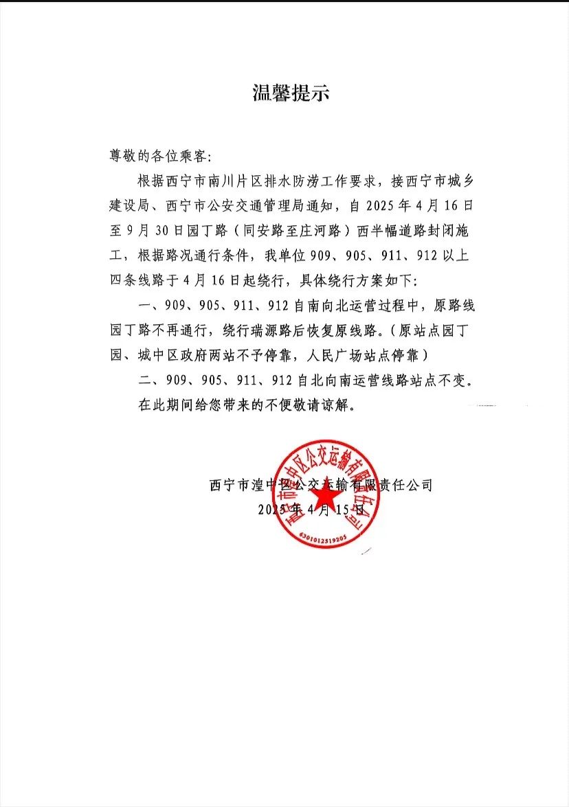 关于909路、905路、911路、912路公交线路绕行的温馨提示