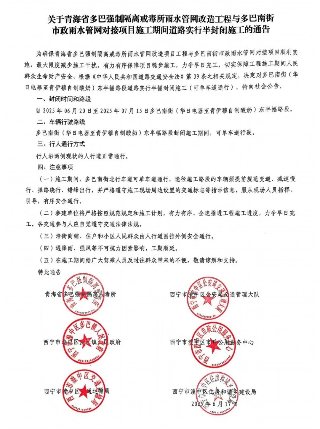 【道路交通】关于青海省多巴强制隔离戒毒所雨水管网改造工程与多巴南街市政雨水管网对接项目施工期间道路实行半封闭施工的通告