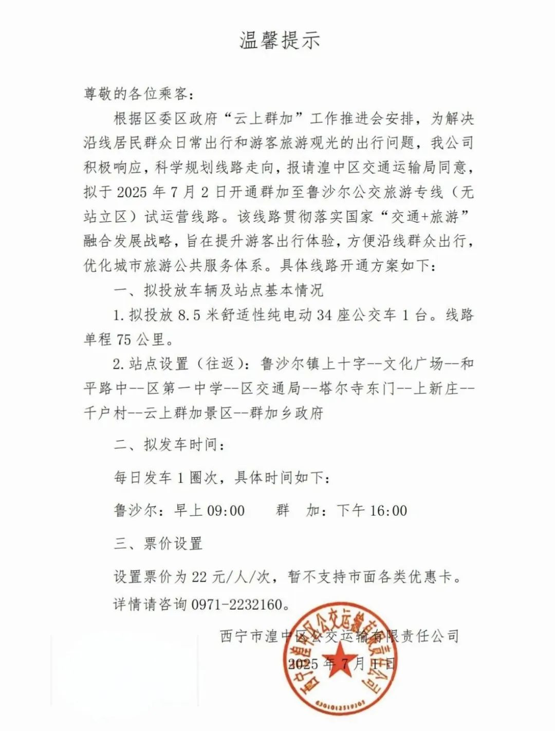 【道路交通】温馨提示:鲁沙尔至群加公交旅游专线开通试运营