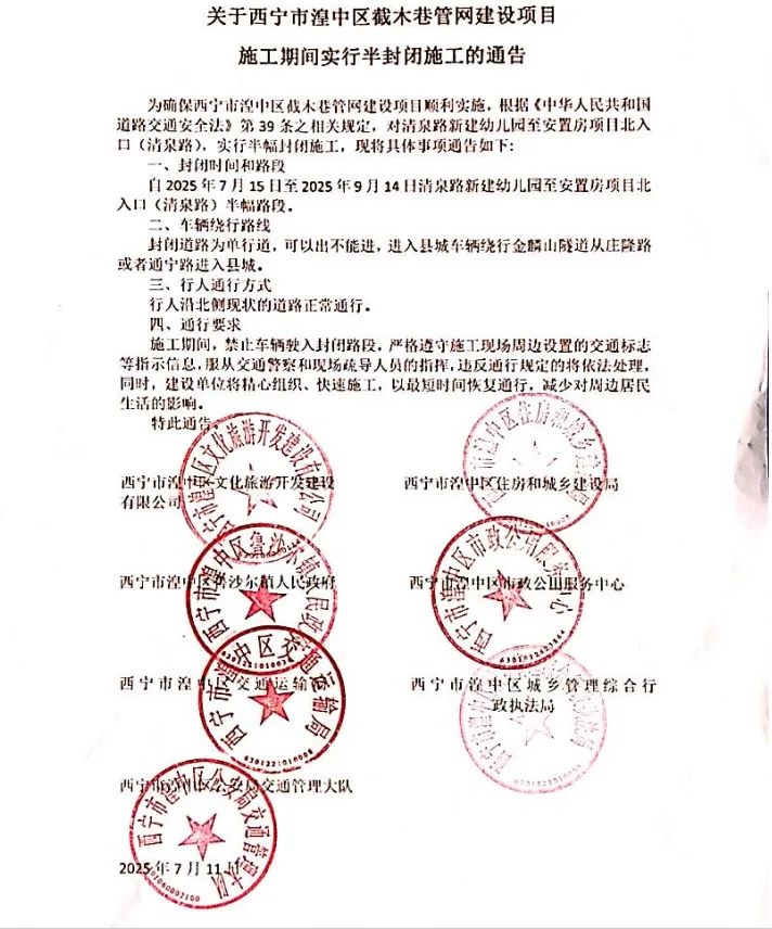 关于西宁市湟中区截木巷管网建设项目施工期间实行半封闭施工的通告