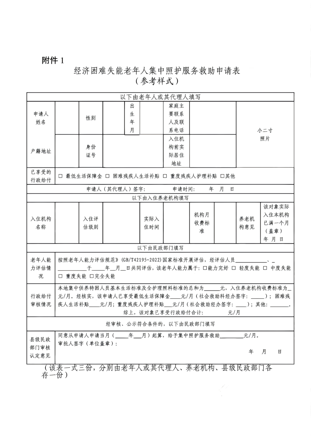 (四)申请补助。老年人本人(其代理人)在入住养老机构满30日后,持养老服务协议和有效缴费凭证(或机构同意缓缴证明),并填写《经济困难失能老年人等群体集中照护服务补助申请表》(见附件),向县(区)级民政部门申请补助。养老机构可协助办理,也可在老年人授权委托下,按照补助人数和补助标准统一向县(区)级民政部门申请补助资金。