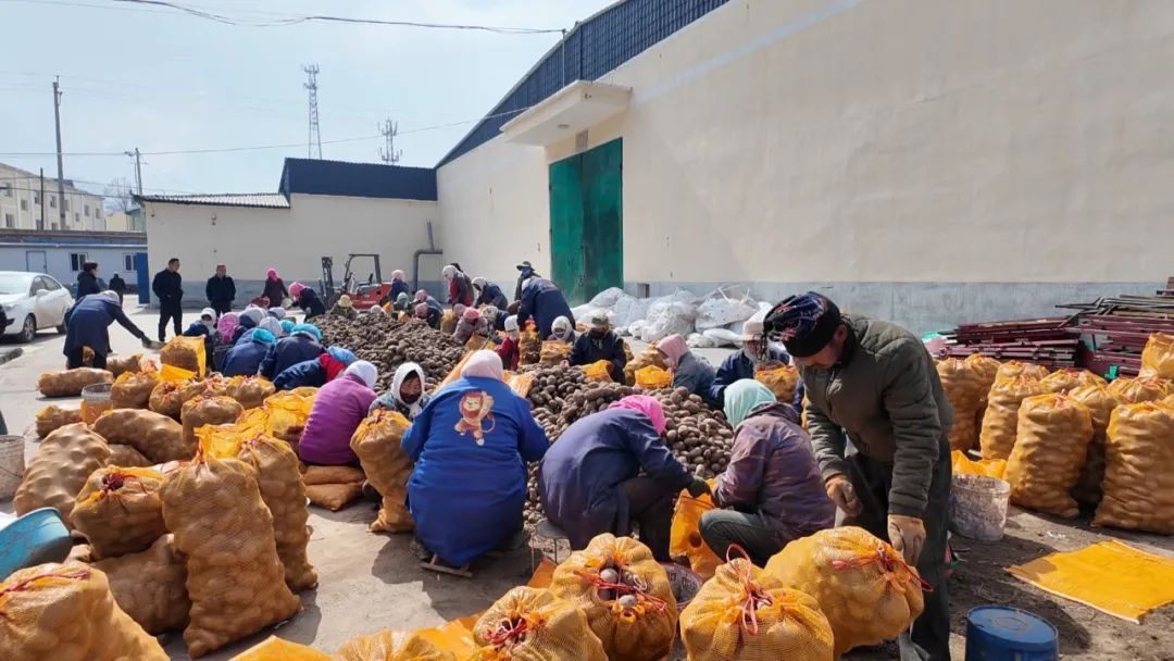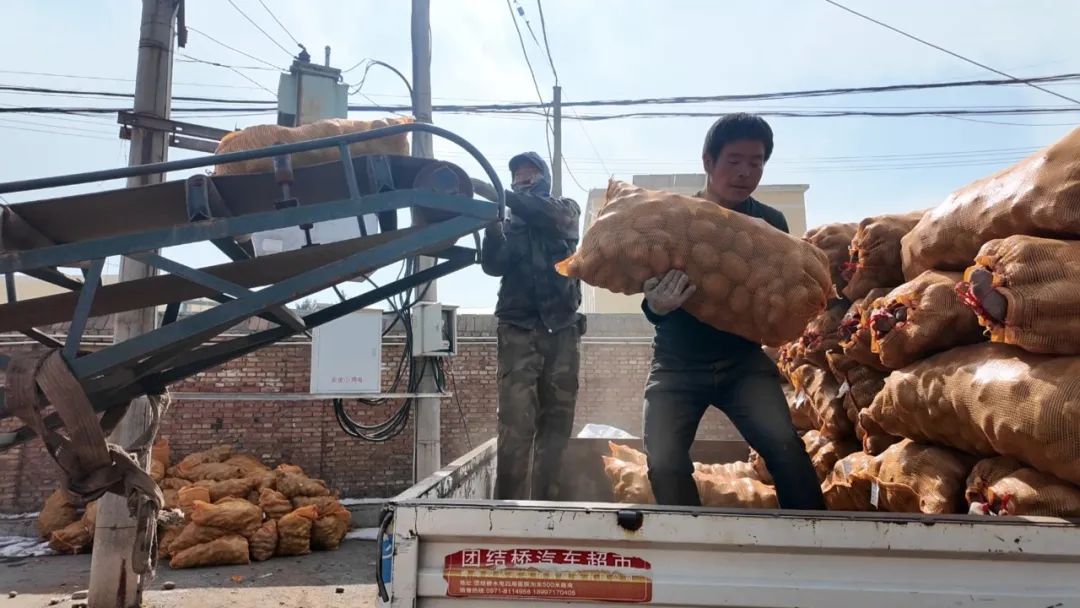 在良种繁育基地的院子里,工人们熟练地分拣着马铃薯,他们仔细挑选出形状饱满、无病害的优质种薯。分拣好的马铃薯被送上运输带,精准无误地装进种植户的车内,运输带的滚轮飞速转动,承载着丰收的希望。