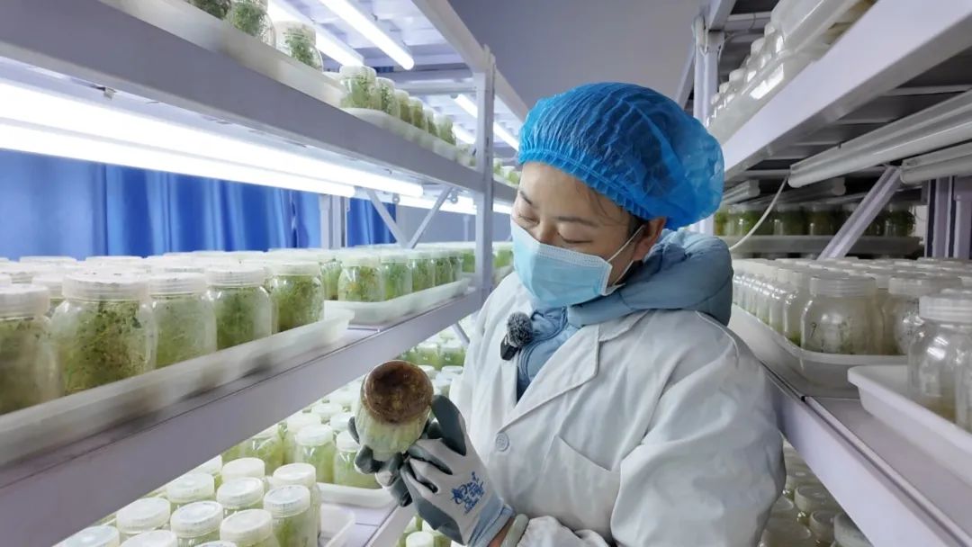 “每天要把这种感染的苗子,比如培养基发黑、发黄的苗子清理出去,然后进行高压灭菌消毒、清洗,每天一遍。”育苗架旁,技术员王惠正逐一检查着已上架的种苗,眼神专注而敏锐。