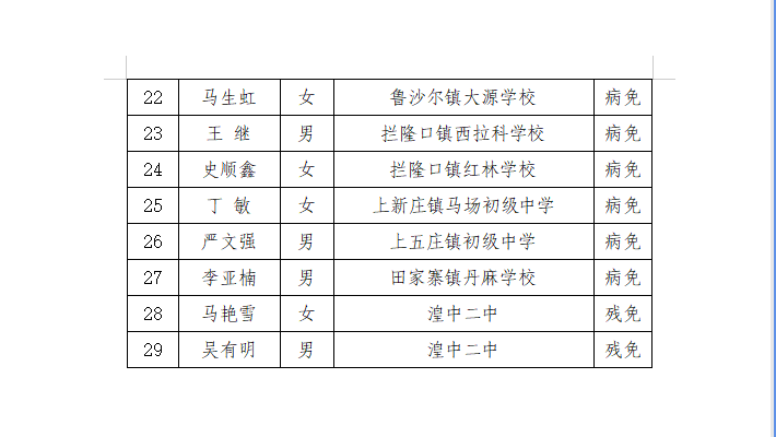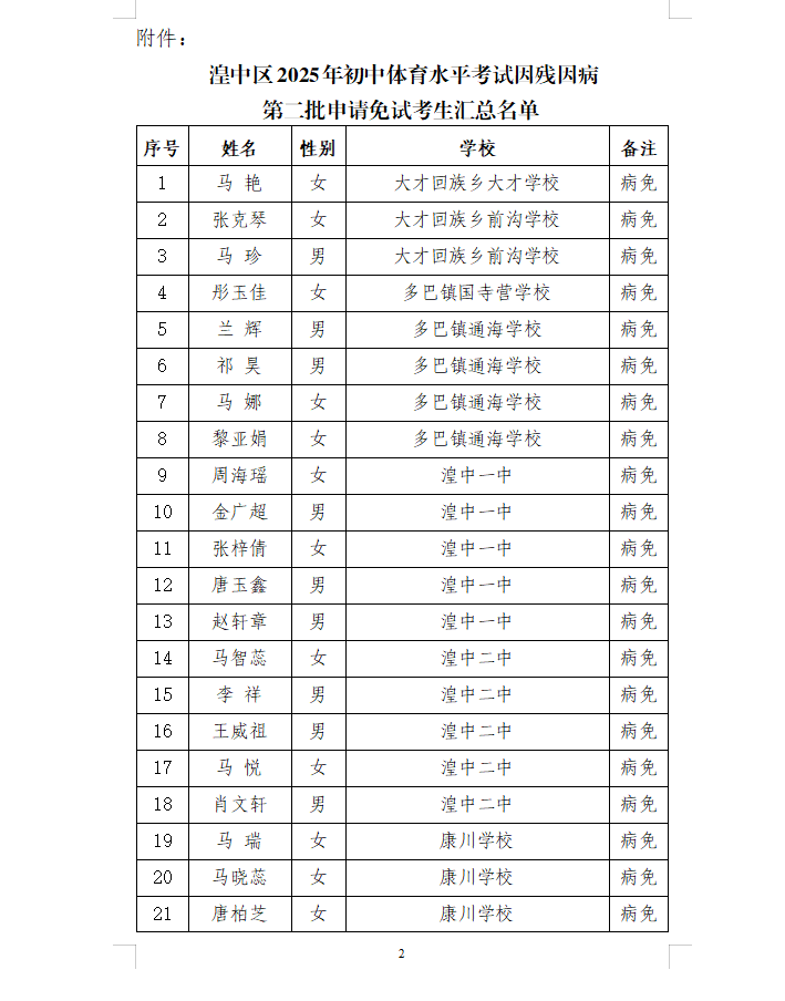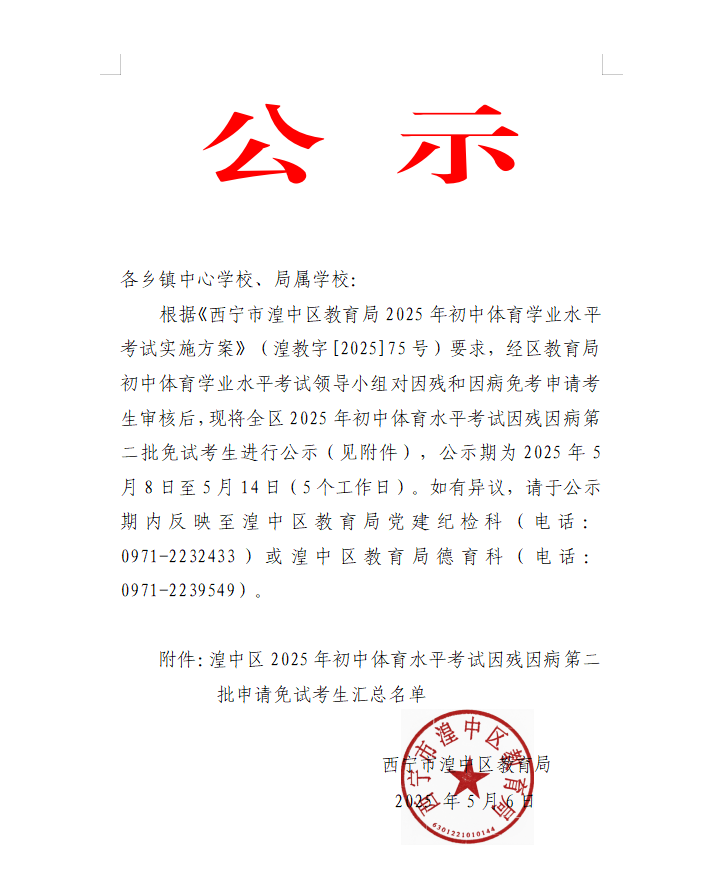 湟中区2025年初中体育水平考试第二批免考考生公示